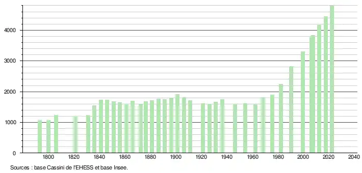 L'évolution du nombre d'habitants est connue à travers les recensements de la population effectués dans la commune depuis 1793. Pour les communes de moins de 10 000 habitants, une enquête de recensement portant sur toute la population est réalisée tous les cinq ans, les populations de référence des années intermédiaires étant quant à elles estimées par interpolation ou extrapolation[36]. Pour la commune, le premier recensement exhaustif entrant dans le cadre du nouveau dispositif a été réalisé en 2007[37].