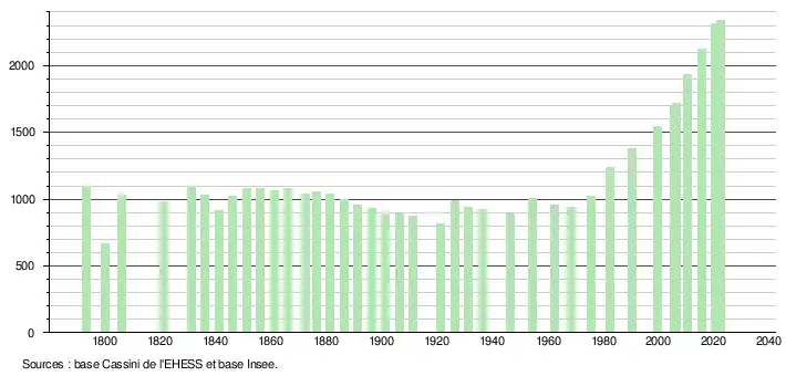 L'évolution du nombre d'habitants est connue à travers les recensements de la population effectués dans la commune depuis 1793. Pour les communes de moins de 10 000 habitants, une enquête de recensement portant sur toute la population est réalisée tous les cinq ans, les populations de référence des années intermédiaires étant quant à elles estimées par interpolation ou extrapolation[22]. Pour la commune, le premier recensement exhaustif entrant dans le cadre du nouveau dispositif a été réalisé en 2005[23].