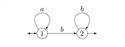 Le monoïde des transitions de l'automate ci-contre a deux éléments : l'identité sur et la permutation qui échange et . Les mots contenant un nombre pair de lettres ont pour image l'identité, les autres la permutation . Le monoïde syntaxique est le groupe des entiers modulo .