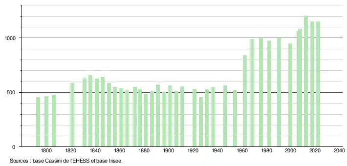 L'évolution du nombre d'habitants est connue à travers les recensements de la population effectués dans la commune depuis 1793. Pour les communes de moins de 10 000 habitants, une enquête de recensement portant sur toute la population est réalisée tous les cinq ans, les populations de référence des années intermédiaires étant quant à elles estimées par interpolation ou extrapolation[28]. Pour la commune, le premier recensement exhaustif entrant dans le cadre du nouveau dispositif a été réalisé en 2007[29].