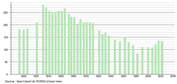 - ↑ Population municipale de référence en vigueur au 1er janvier 2025, millésimée 2022, définie dans les limites territoriales en vigueur au 1er janvier 2024, date de référence statistique : 1er janvier 2022.
