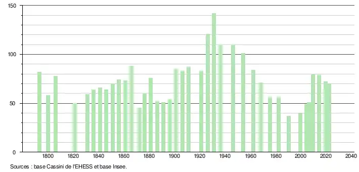 L'évolution du nombre d'habitants est connue à travers les recensements de la population effectués dans la commune depuis 1793. Pour les communes de moins de 10 000 habitants, une enquête de recensement portant sur toute la population est réalisée tous les cinq ans, les populations de référence des années intermédiaires étant quant à elles estimées par interpolation ou extrapolation[28]. Pour la commune, le premier recensement exhaustif entrant dans le cadre du nouveau dispositif a été réalisé en 2004[29].
