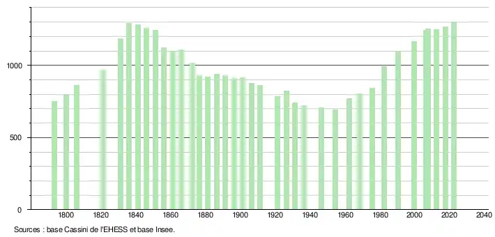 L'évolution du nombre d'habitants est connue à travers les recensements de la population effectués dans la commune depuis 1793. Pour les communes de moins de 10 000 habitants, une enquête de recensement portant sur toute la population est réalisée tous les cinq ans, les populations de référence des années intermédiaires étant quant à elles estimées par interpolation ou extrapolation[15]. Pour la commune, le premier recensement exhaustif entrant dans le cadre du nouveau dispositif a été réalisé en 2007[16].
