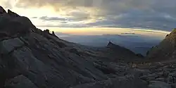 Le mont Kinabalu couvre une superficie d'environ 750 km2[8]. Il est surmonté par un vaste plateau sommital d'où quelques cimes dépassent, dont le Low's Peak (4 095 m), le Victoria Peak (4 091 m), le St. John's Peak (4 091 m), le King Edward's Peak (4 086 m), les Donkey's Ears (4 048 m), l’Ugly Sister Peak (4 032 m), le St. Alexandra Peak (3 998 m), l’Oyayubi Iwu Peak (3 976 m), et le South Peak (3 922 m)[9],[10],[11]. En 1997, une nouvelle étude basée sur des mesures satellites a ramené l'altitude du pic principal, Low's Peak, à 4 095 mètres[1], soit six mètres de moins que la précédente valeur connue à 4 101 mètres[2].