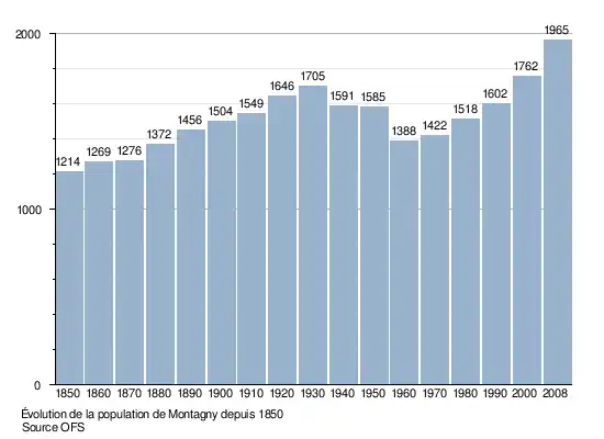 Selon l’Office fédéral de la statistique, Montagny compte 3 017 habitants en 2023[1]. Sa densité de population atteint 172 hab./km2.