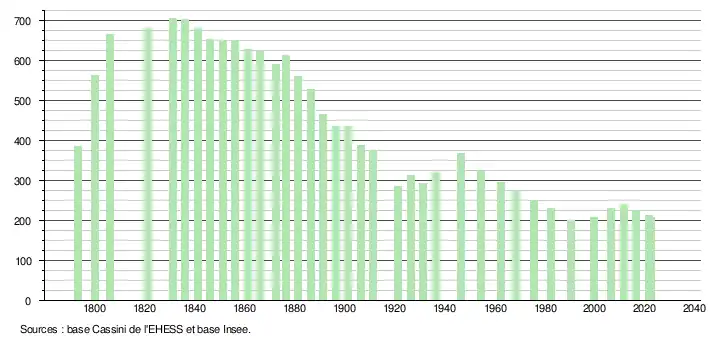 L'évolution du nombre d'habitants est connue à travers les recensements de la population effectués dans la commune depuis 1793. Pour les communes de moins de 10 000 habitants, une enquête de recensement portant sur toute la population est réalisée tous les cinq ans, les populations de référence des années intermédiaires étant quant à elles estimées par interpolation ou extrapolation[32]. Pour la commune, le premier recensement exhaustif entrant dans le cadre du nouveau dispositif a été réalisé en 2006[33].
