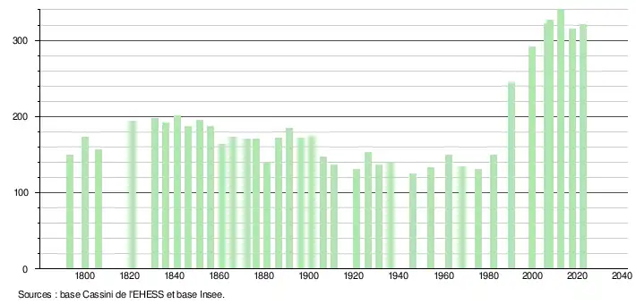 L'évolution du nombre d'habitants est connue à travers les recensements de la population effectués dans la commune depuis 1793. Pour les communes de moins de 10 000 habitants, une enquête de recensement portant sur toute la population est réalisée tous les cinq ans, les populations de référence des années intermédiaires étant quant à elles estimées par interpolation ou extrapolation[21]. Pour la commune, le premier recensement exhaustif entrant dans le cadre du nouveau dispositif a été réalisé en 2007[22].