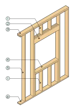 Les montants d'ossature murale utilisés pour encadrer les ouvertures des fenêtres et des portes portent des noms différents dans la terminologie américaine, notamment[9]:
