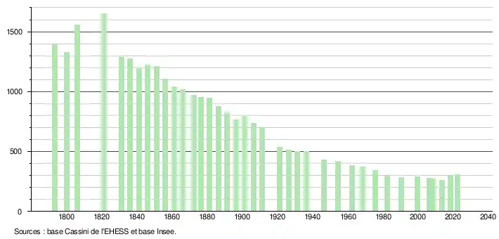 L'évolution du nombre d'habitants est connue à travers les recensements de la population effectués dans la commune depuis 1793. Pour les communes de moins de 10 000 habitants, une enquête de recensement portant sur toute la population est réalisée tous les cinq ans, les populations de référence des années intermédiaires étant quant à elles estimées par interpolation ou extrapolation[32]. Pour la commune, le premier recensement exhaustif entrant dans le cadre du nouveau dispositif a été réalisé en 2008[33]. En 2022, la commune comptait 306 habitants[Note 4], en évolution de +12,09 % par rapport à 2016 (Haute-Garonne : +8,02 %, France hors Mayotte : +2,11 %).