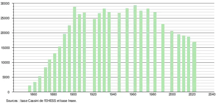 - ↑ Par convention dans Wikipédia, le principe a été retenu de n’afficher dans le tableau des recensements et le graphique, pour les populations de référence postérieures à 1999, que les populations correspondant à une enquête exhaustive de recensement pour les communes de moins de 10 000 habitants, et que les populations des années 2006, 2011, 2016, etc. pour les communes de plus de 10 000 habitants, ainsi que la dernière population de référence publiée par l’Insee pour l'ensemble des communes.