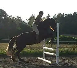 Monter avec les orteils vers le bas peut conduire à se cramponner à cheval avec les jambes, ou à creuser dans les côtes du cheval avec les talons, ce qui est souvent interprété par le cheval comme une demande pour aller plus vite[4].