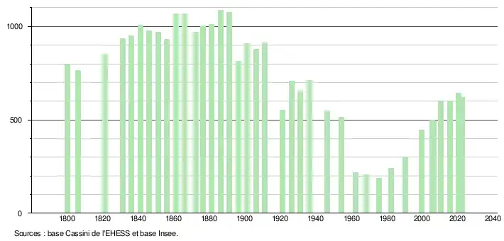 L'évolution du nombre d'habitants est connue à travers les recensements de la population effectués dans la commune depuis 1800. Pour les communes de moins de 10 000 habitants, une enquête de recensement portant sur toute la population est réalisée tous les cinq ans, les populations de référence des années intermédiaires étant quant à elles estimées par interpolation ou extrapolation[13]. Pour la commune, le premier recensement exhaustif entrant dans le cadre du nouveau dispositif a été réalisé en 2005[14].