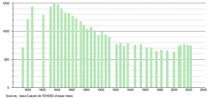 L'évolution du nombre d'habitants est connue à travers les recensements de la population effectués dans la commune depuis 1793. Pour les communes de moins de 10 000 habitants, une enquête de recensement portant sur toute la population est réalisée tous les cinq ans, les populations de référence des années intermédiaires étant quant à elles estimées par interpolation ou extrapolation[28]. Pour la commune, le premier recensement exhaustif entrant dans le cadre du nouveau dispositif a été réalisé en 2008[29].