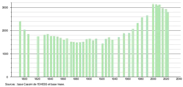 L'évolution du nombre d'habitants est connue à travers les recensements de la population effectués dans la commune depuis 1793. Pour les communes de moins de 10 000 habitants, une enquête de recensement portant sur toute la population est réalisée tous les cinq ans, les populations de référence des années intermédiaires étant quant à elles estimées par interpolation ou extrapolation[28]. Pour la commune, le premier recensement exhaustif entrant dans le cadre du nouveau dispositif a été réalisé en 2004[29].