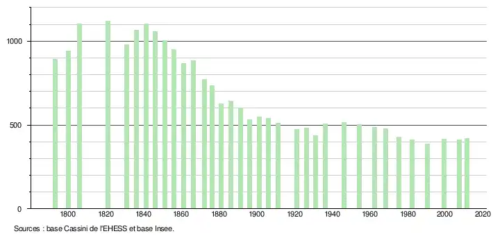 L'évolution du nombre d'habitants est connue à travers les recensements de la population effectués dans la commune depuis 1793. À partir du , les populations légales des communes sont publiées annuellement dans le cadre d'un recensement qui repose désormais sur une collecte d'information annuelle, concernant successivement tous les territoires communaux au cours d'une période de cinq ans. Pour les communes de moins de 10 000 habitants, une enquête de recensement portant sur toute la population est réalisée tous les cinq ans, les populations légales des années intermédiaires étant quant à elles estimées par interpolation ou extrapolation[6]. Pour la commune, le premier recensement exhaustif entrant dans le cadre du nouveau dispositif a été réalisé en 2007[7],[Note 2].