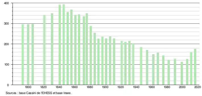 L'évolution du nombre d'habitants est connue à travers les recensements de la population effectués dans la commune depuis 1793. Pour les communes de moins de 10 000 habitants, une enquête de recensement portant sur toute la population est réalisée tous les cinq ans, les populations de référence des années intermédiaires étant quant à elles estimées par interpolation ou extrapolation[16]. Pour la commune, le premier recensement exhaustif entrant dans le cadre du nouveau dispositif a été réalisé en 2006[17].