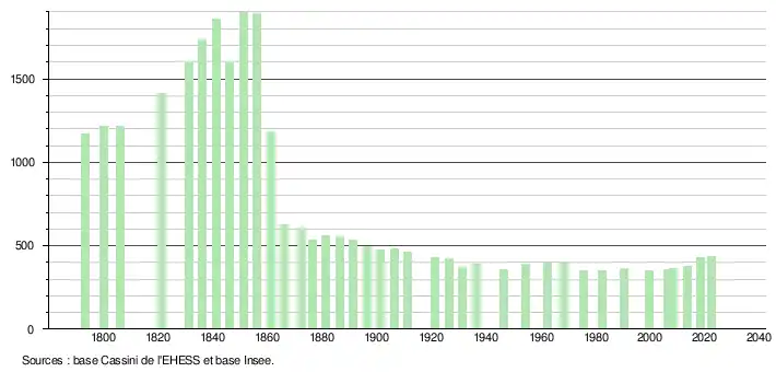 L'évolution du nombre d'habitants est connue à travers les recensements de la population effectués dans la commune depuis 1793. Pour les communes de moins de 10 000 habitants, une enquête de recensement portant sur toute la population est réalisée tous les cinq ans, les populations de référence des années intermédiaires étant quant à elles estimées par interpolation ou extrapolation[22]. Pour la commune, le premier recensement exhaustif entrant dans le cadre du nouveau dispositif a été réalisé en 2008[23].