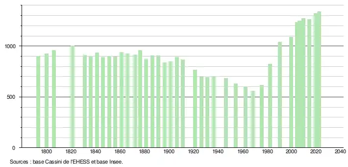 L'évolution du nombre d'habitants est connue à travers les recensements de la population effectués dans la commune depuis 1793. Pour les communes de moins de 10 000 habitants, une enquête de recensement portant sur toute la population est réalisée tous les cinq ans, les populations de référence des années intermédiaires étant quant à elles estimées par interpolation ou extrapolation[21]. Pour la commune, le premier recensement exhaustif entrant dans le cadre du nouveau dispositif a été réalisé en 2004[22].