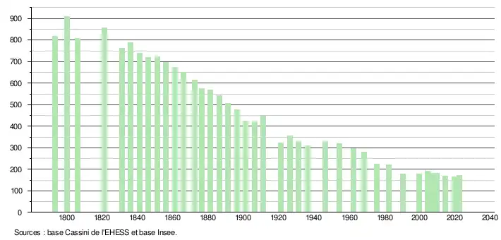 | L'évolution du nombre d'habitants est connue à travers les recensements de la population effectués dans la commune depuis 1793. Pour les communes de moins de 10 000 habitants, une enquête de recensement portant sur toute la population est réalisée tous les cinq ans, les populations de référence des années intermédiaires étant quant à elles estimées par interpolation ou extrapolation[29]. Pour la commune, le premier recensement exhaustif entrant dans le cadre du nouveau dispositif a été réalisé en 2004[30]. En 2022, la commune comptait 171 habitants[Note 7], en évolution de +4,27 % par rapport à 2016 (Tarn-et-Garonne : +3,12 %, France hors Mayotte : +2,11 %). |