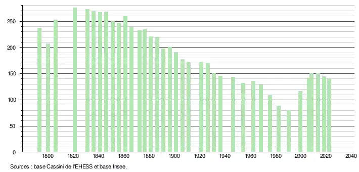 L'évolution du nombre d'habitants est connue à travers les recensements de la population effectués dans la commune depuis 1793. Pour les communes de moins de 10 000 habitants, une enquête de recensement portant sur toute la population est réalisée tous les cinq ans, les populations de référence des années intermédiaires étant quant à elles estimées par interpolation ou extrapolation[16]. Pour la commune, le premier recensement exhaustif entrant dans le cadre du nouveau dispositif a été réalisé en 2008[17].