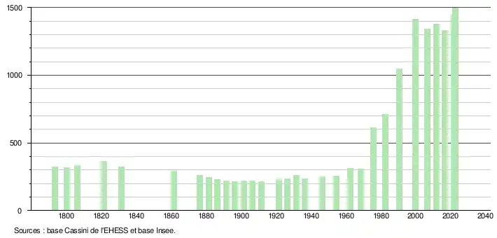 L'évolution du nombre d'habitants est connue à travers les recensements de la population effectués dans la commune depuis 1793. Pour les communes de moins de 10 000 habitants, une enquête de recensement portant sur toute la population est réalisée tous les cinq ans, les populations de référence des années intermédiaires étant quant à elles estimées par interpolation ou extrapolation[17]. Pour la commune, le premier recensement exhaustif entrant dans le cadre du nouveau dispositif a été réalisé en 2006[18].