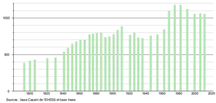 L'évolution du nombre d'habitants est connue à travers les recensements de la population effectués dans la commune depuis 1793. À partir du , les populations légales des communes sont publiées annuellement dans le cadre d'un recensement qui repose désormais sur une collecte d'information annuelle, concernant successivement tous les territoires communaux au cours d'une période de cinq ans. Pour les communes de moins de 10 000 habitants, une enquête de recensement portant sur toute la population est réalisée tous les cinq ans, les populations légales des années intermédiaires étant quant à elles estimées par interpolation ou extrapolation[20]. Pour la commune, le premier recensement exhaustif entrant dans le cadre du nouveau dispositif a été réalisé en 2006[21],[Note 4].