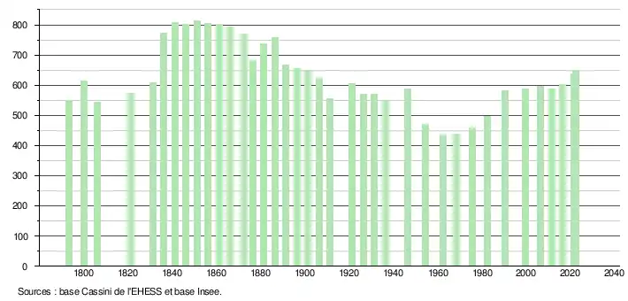 L'évolution du nombre d'habitants est connue à travers les recensements de la population effectués dans la commune depuis 1793. Pour les communes de moins de 10 000 habitants, une enquête de recensement portant sur toute la population est réalisée tous les cinq ans, les populations de référence des années intermédiaires étant quant à elles estimées par interpolation ou extrapolation[41]. Pour la commune, le premier recensement exhaustif entrant dans le cadre du nouveau dispositif a été réalisé en 2006[42].