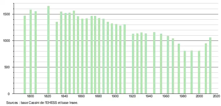 L'évolution du nombre d'habitants est connue à travers les recensements de la population effectués dans la commune depuis 1793. À partir du , les populations légales des communes sont publiées annuellement dans le cadre d'un recensement qui repose désormais sur une collecte d'information annuelle, concernant successivement tous les territoires communaux au cours d'une période de cinq ans. Pour les communes de moins de 10 000 habitants, une enquête de recensement portant sur toute la population est réalisée tous les cinq ans, les populations légales des années intermédiaires étant quant à elles estimées par interpolation ou extrapolation[3]. Pour la commune, le premier recensement exhaustif entrant dans le cadre du nouveau dispositif a été réalisé en 2007[4],[Note 2].