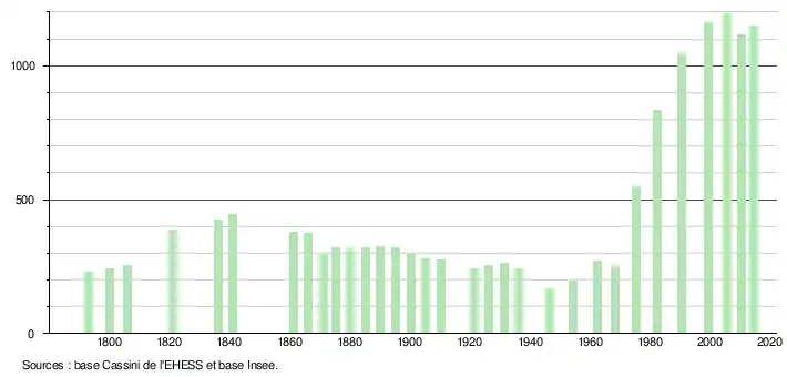 L'évolution du nombre d'habitants est connue à travers les recensements de la population effectués dans la commune depuis 1793. À partir du , les populations légales des communes sont publiées annuellement dans le cadre d'un recensement qui repose désormais sur une collecte d'information annuelle, concernant successivement tous les territoires communaux au cours d'une période de cinq ans. Pour les communes de moins de 10 000 habitants, une enquête de recensement portant sur toute la population est réalisée tous les cinq ans, les populations légales des années intermédiaires étant quant à elles estimées par interpolation ou extrapolation[10]. Pour la commune, le premier recensement exhaustif entrant dans le cadre du nouveau dispositif a été réalisé en 2005[11],[Note 1].