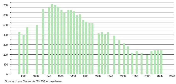 L'évolution du nombre d'habitants est connue à travers les recensements de la population effectués dans la commune depuis 1793. Pour les communes de moins de 10 000 habitants, une enquête de recensement portant sur toute la population est réalisée tous les cinq ans, les populations de référence des années intermédiaires étant quant à elles estimées par interpolation ou extrapolation[25]. Pour la commune, le premier recensement exhaustif entrant dans le cadre du nouveau dispositif a été réalisé en 2006[26].