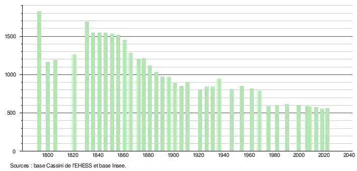 L'évolution du nombre d'habitants est connue à travers les recensements de la population effectués dans la commune depuis 1793. Pour les communes de moins de 10 000 habitants, une enquête de recensement portant sur toute la population est réalisée tous les cinq ans, les populations de référence des années intermédiaires étant quant à elles estimées par interpolation ou extrapolation[27]. Pour la commune, le premier recensement exhaustif entrant dans le cadre du nouveau dispositif a été réalisé en 2008[28].