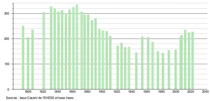 L'évolution du nombre d'habitants est connue à travers les recensements de la population effectués dans la commune depuis 1793. Pour les communes de moins de 10 000 habitants, une enquête de recensement portant sur toute la population est réalisée tous les cinq ans, les populations de référence des années intermédiaires étant quant à elles estimées par interpolation ou extrapolation[22]. Pour la commune, le premier recensement exhaustif entrant dans le cadre du nouveau dispositif a été réalisé en 2007[23].