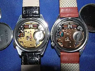 - ↑ (en) Brevet US 3098185A "Electric watch having transistor controlled contact", Roderick Jackson pour Hamilton Watch, délivré le 16 juillet 1963.