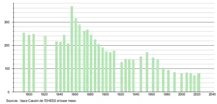 L'évolution du nombre d'habitants est connue à travers les recensements de la population effectués dans la commune depuis 1793. Pour les communes de moins de 10 000 habitants, une enquête de recensement portant sur toute la population est réalisée tous les cinq ans, les populations de référence des années intermédiaires étant quant à elles estimées par interpolation ou extrapolation[30]. Pour la commune, le premier recensement exhaustif entrant dans le cadre du nouveau dispositif a été réalisé en 2006[31].