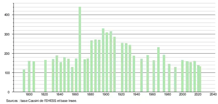 L'évolution du nombre d'habitants est connue à travers les recensements de la population effectués dans la commune depuis 1793. Pour les communes de moins de 10 000 habitants, une enquête de recensement portant sur toute la population est réalisée tous les cinq ans, les populations de référence des années intermédiaires étant quant à elles estimées par interpolation ou extrapolation[15]. Pour la commune, le premier recensement exhaustif entrant dans le cadre du nouveau dispositif a été réalisé en 2005[16].