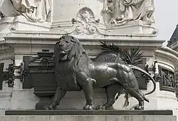Au niveau du sol, un lion en bronze de 3 m de hauteur ajoute sa force à celle du suffrage universel (entendu à l'époque comme uniquement masculin), représenté par une urne en bronze.