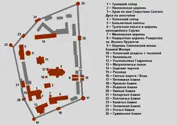 * 2/ Église Nikon * 3/ Église de la Pentecôte * 4/ Cathédrale de la Dormition * 5/ Église Saints-Zosime-et-Sabbas * 6/ Trapeznaïa * 7/ Église Mikeevskaïa * 8/ Nativité de Saint Jean le Baptiste * 9/ Église de l'icône de Smolensk * 10/ chapelle * 11/ Clocher * 12/13/14/15/ Divers * 16/ Saintes portes * 17 à 26 / Dix tours des remparts |