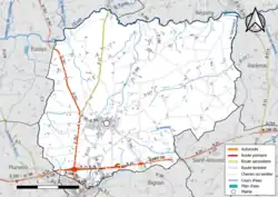 La commune est traversée par des axes routiers importants : la Route nationale 24, axe Rennes-Lorient, aménagée en voie expresse, passe dans la partie sud du territoire communal ; la D 767 (ancienne Route nationale 167), est aussi aménagée en voie expresse entre Vannes et Pontivy et traverse selon une orientation sud-nord la partie ouest de la commune ; la D 17 s'y embranche en diection de Naizin et Rohan. L'échangeur de Kerabuse, situé au carrefour des deux voies expresses précitées, se trouve dans la partie sud-ouest de la commune, aussi desservie par l'échangeur du Bardeff situé sur la RN 24 à l'est du précédent, et qui a permis le développement d'une importante zone industrielle à proximité.