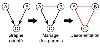 Pour moraliser le graphe, on doit marier les parents d'un même sommet, puis désorienter le graphe[1]. Cette étape peut s'effectuer en temps linéaire .
