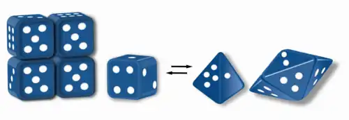 Ceci peut être illustré en représentant les monomères par des dés pouvant être tantôt cubiques (à six faces), tantôt tétraédriques (à quatre faces), ces dés pouvant s'assembler en mettant en contact leurs faces 1 et 4 : les cubes peuvent ainsi s'assembler en structures de quatre dés (tétramère), tandis que les tétraèdres peuvent s'assembler en structures de cinq dés (pentamère), le passage de l'un à l'autre nécessitant de dissocier entièrement ces structures pour permettre à chaque dé, libéré d'interactions avec ses voisins, de changer individuellement de forme.