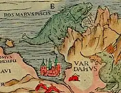 Grossière représentation d'un morse en haut, au centre droit de la Carta Marina.