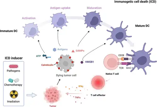 La mort cellulaire immunogène est le mécanisme d'achèvement de la vie de certaines cellules déterminé par le système immunitaire. Tel que défini par le Comité de nomenclature sur la mort cellulaire, la mort cellulaire immunogène est une modalité de la mort cellulaire régulée [1],[2]. L'activation de la mort cellulaire dépend de programmes de transduction de signalisation et peut donc être déclenchée ou modulée par des médicaments et des composants génétiques [1]. La mort cellulaire diffère des autres types de mort cellulaire programmée, tels que la nécroptose, la ferroptose et la pyroptose, non seulement par les conditions dans lesquelles elle est déclenchée, mais également par le fait qu'elle active une réponse immunitaire adaptative chez des hôtes syngéniques immunocompétents contre les antigènes exprimés par la cellule mourante.