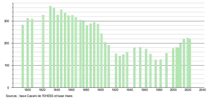 L'évolution du nombre d'habitants est connue à travers les recensements de la population effectués dans la commune depuis 1793. Pour les communes de moins de 10 000 habitants, une enquête de recensement portant sur toute la population est réalisée tous les cinq ans, les populations de référence des années intermédiaires étant quant à elles estimées par interpolation ou extrapolation[25]. Pour la commune, le premier recensement exhaustif entrant dans le cadre du nouveau dispositif a été réalisé en 2004[26].