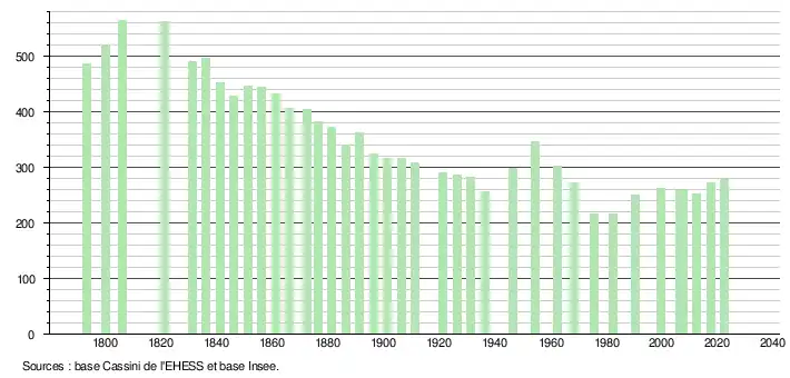 L'évolution du nombre d'habitants est connue à travers les recensements de la population effectués dans la commune depuis 1793. Pour les communes de moins de 10 000 habitants, une enquête de recensement portant sur toute la population est réalisée tous les cinq ans, les populations de référence des années intermédiaires étant quant à elles estimées par interpolation ou extrapolation[32]. Pour la commune, le premier recensement exhaustif entrant dans le cadre du nouveau dispositif a été réalisé en 2007[33].