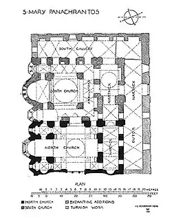 Tout comme la Nea Ekklesia, l’église nord fut l’une des toutes premières à être construite sur un plan *« à croix-inscrite » à Constantinople[12]. Au cours de la période ottomane, les quatre colonnes centrales furent remplacées par deux arcs en pointe qui s’étendent sur toute l’église[13].