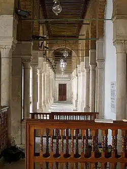 La coupole du narthex située à l'entrée de la salle de prière, dite du bahou, dispose d'un décor alternant une pierre ocre et une brique rouge[3]. Les nombreuses niches couvrant la base carrée et le tambour octogonal la rattache à l'art fatimide[3]. La salle de prière hypostyle de forme rectangulaire (56 mètres sur 24) couvre pour sa part 1 344 m2[3] alors que près de 160 colonnes et chapiteaux antiques délimitent 15 nefs et 6 travées[3]. La nef médiane et la nef transversale du transept, plus larges que les autres (4,80 mètres au lieu de 3 mètres), se croisent devant le mihrab qui est lui-même précédé d'une coupole portant une inscription l'attribuant au calife abbasside Al-Musta`in[3]. Le minaret carré, à l'angle nord-ouest de la cour, haut de 43 mètres[7], reprend la décoration du minaret almohade de la mosquée de la Kasbah faite d'entrelacs en calcaire sur un fond en grès ocre[3].