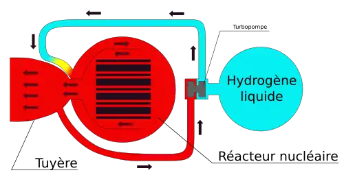 Le moteur-fusée est le type de moteur au principe de fonctionnement le plus simple : deux ergols brûlent dans une chambre de combustion, sont accélérés puis éjectés par une tuyère de Laval.
