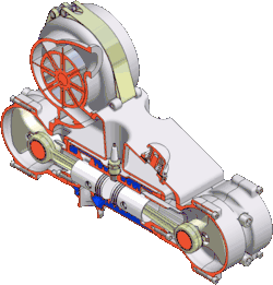 - Un arbre courait parallèlement à deux cylindres, entraînant à chacune de ses extrémités un piston axial. Ce dernier repoussait via des bielles les pistons l'un vers l'autre[6].