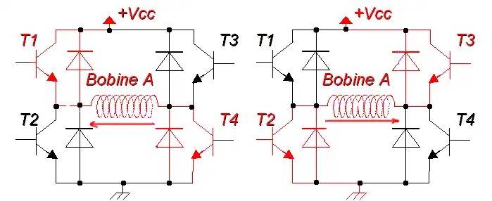 C'est le principe du pont en H, si on commande T1 et T4, alors on alimente dans un sens, soit on alimente en T2 et T3, on change le sens de l'alimentation, donc le sens du courant.