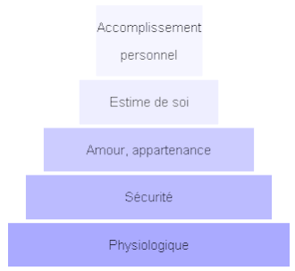 La théorie de la hiérarchie des besoins d'Abraham Maslow[5] hiérarchise les besoins, et dit que plus on se situe à un échelon proche du haut de la pyramide, et plus la motivation est importante. Mais on ne peut accéder aux niveaux supérieurs que si les besoins plus primaires, soit inférieurs dans la hiérarchie postulée, sont satisfaits. Dans un premier temps, il est primordial pour l'être humain de combler ses besoins physiologiques, suivis de ses besoins de sécurité. Dans cette logique de hiérarchie, il ne peut combler ses besoins de sécurité avant d'avoir comblé ses besoins physiologiques. Entrent ensuite en jeu les besoins sociaux, le besoin d'estime de soi et pour terminer, les besoins d'actualisation.